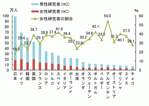 この項では、各国・地域の女性研究者の割合を比較する。研究者の多様性向上の観点からも女性研究者の活躍が期待されている。