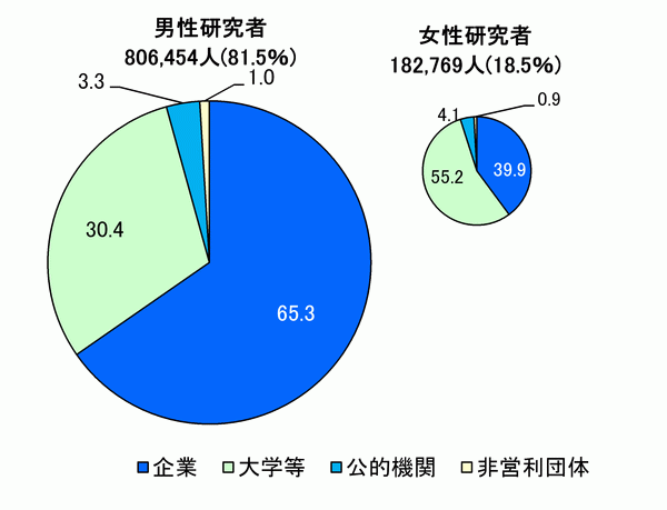 男性研究者の多くが「企業」に在籍しているのに対して、女性研究者の多くは「大学等」に在籍している。博士号保持者は、男女ともに「大学等」に多く在籍している(図表2-1-13(B))。