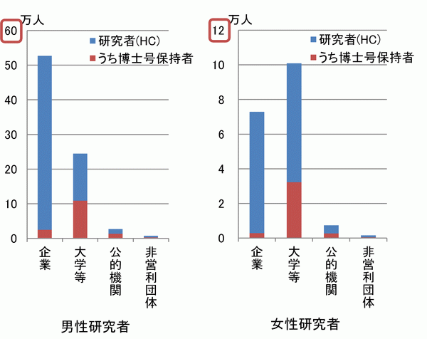 HC(実数)である。男性の数値は合計から女性の数値を引いたものである。該当年の3月31日時点の研究者数を測定している。