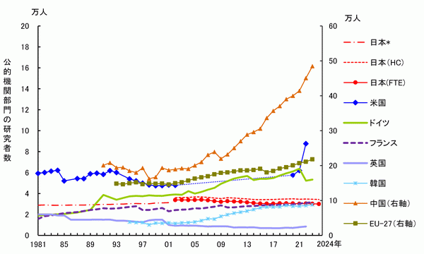 - 公的機関部門の研究者数を見ると、日本の研究者数(FTE値)は2000年代後半から漸減傾向にあり、2024年では3.0万人である。中国の研究者数が増加しており、48.5万人(2023年)と世界第1位の規模である。米国の研究者数は8.8万人(2022年)、ドイツの研究者数は5.3万人(2023年(非営利団体を除いた値。含めると6.6万人))である。