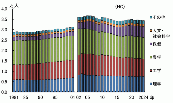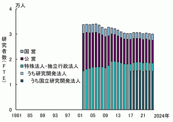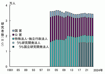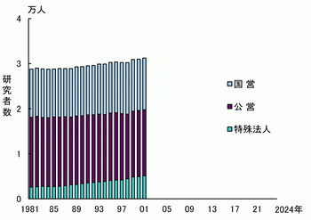 3) 2001年以前の値は該当年の4月1日時点の研究者数、2002年以降の値は3月31日時点の研究者数を測定している。