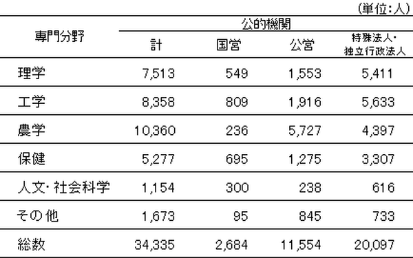 公的機関の研究者数を専門別に見る。ここでいう専門とは、研究者個人の専門的知識を指す。