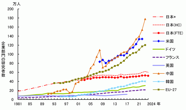 2) 日本の研究者数は3種類のデータがある。日本*はFTEかHCについて明確な定義がされていない値、日本(FTE)はFTE研究者数、日本(HC)はHC研究者数。2001年以前は該当年の4月1日、2002年以降は該当年の3月31日時点の数を示している。