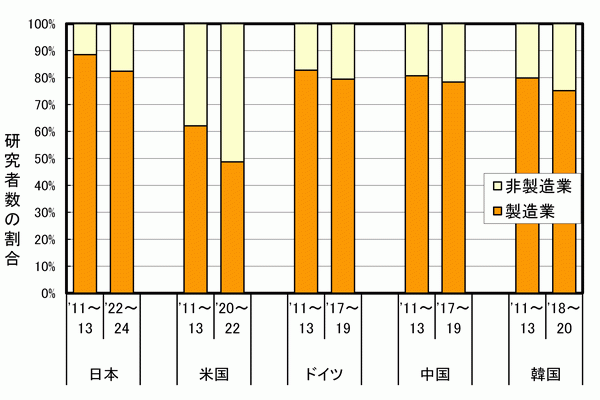 2) 日本の産業分類は日本標準産業分類に基づいた科学技術研究調査の産業分類を使用。日本は該当年の3月31日時点の研究者数を測定している。