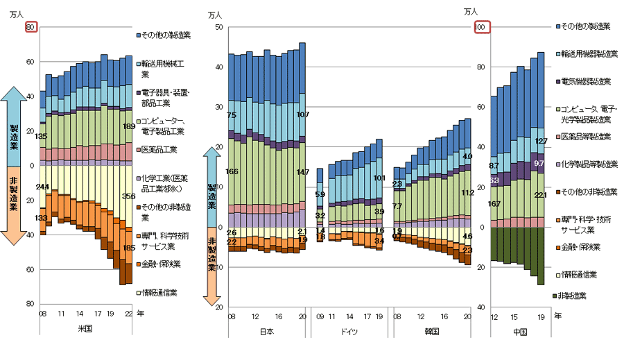 米国では製造業、非製造業ともに2010年から拡大していた。製造業については、2015年からほぼ横ばいに推移している。非製造業は継続して増加していたが、2022年では横ばいに推移した。製造業では「コンピュータ、電子製品工業」が、非製造業では「情報通信業」が多くを占めている。「情報通信業」は2010年から約3倍に増加した。