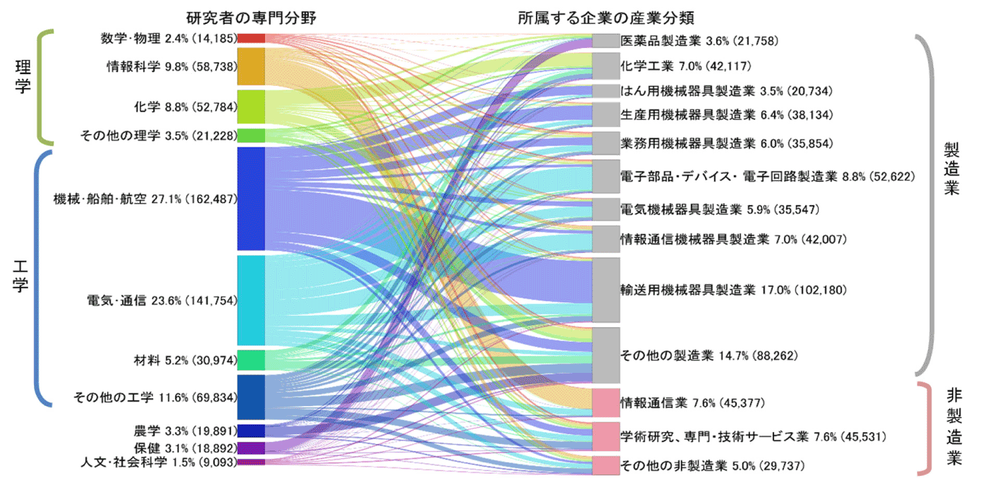 日本の企業に所属する研究者はどのような専門的知識を持っているのだろうか。ここでは、産業分類別に、その業種に所属する研究者の専門分野を見る(図表2-2-8)。
