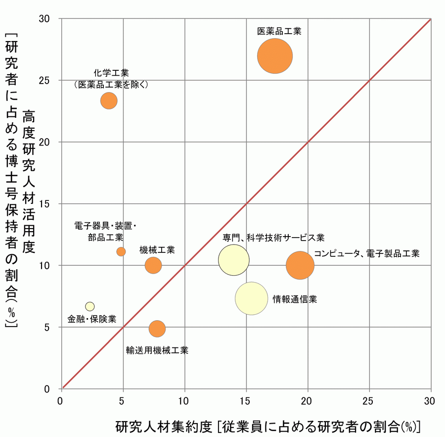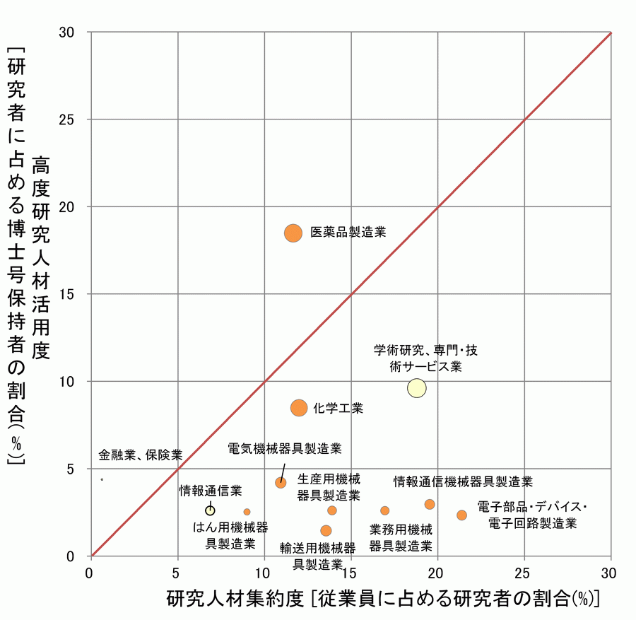産業分類別の研究人材集約度と高度研究人材活用度の関係を示す。横軸が研究人材集約度(HC研究者数/従業員数)、縦軸が高度研究人材活用度(博士号保持者数/HC研究者数)であり、円の面積が博士号保持者の数に対応している。