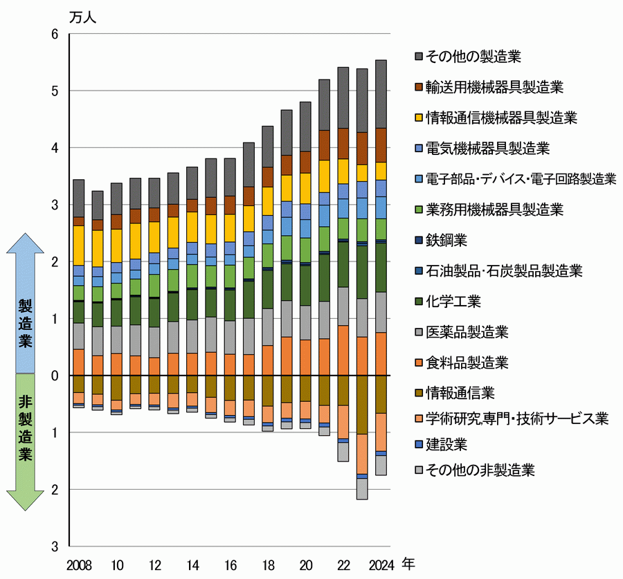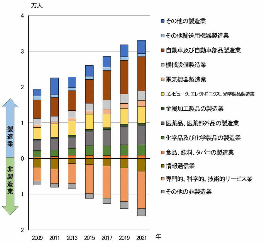 ドイツを見ると(図表2-2-10(B))、2021年の製造業では3.3万人、非製造業は1.6万人であり、7対3のバランスである。2021年の内訳を見ると、製造業では「自動車及び自動車部品製造業」が最も多く、次いで「医薬品、医薬部外品の製造業」が多い。非製造業では「専門的、科学的、技術的サービス業」が多く、非製造業全体の約7割を占めている。