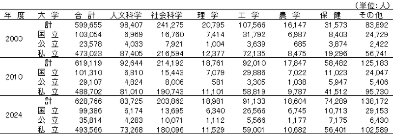 分野別に見ると、国立大学では「自然科学」系、特に「工学」系の入学者数が多く、私立大学の入学者数は「社会科学」系が多い。ただし、私立大学全体で見た構成比では「社会科学」系が減少傾向にある。また、「保健」系、「その他」の入学者数は、2000年度と比べると国・公・私立大学ともに増加している。なかでも私立大学については、2000年度と比較して2024年度はいずれも約3倍となっている。
