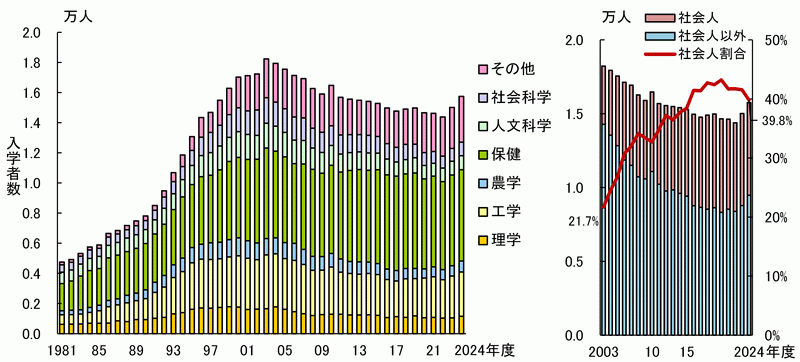 - 大学院博士課程の入学者数は、2003年度をピークに長期的な減少傾向にあったが、2023年度から増加し、2024年度は対前年度比4.9%増の1.6万人となった。うち社会人博士課程入学者数は長期的に増加傾向にあった。2018年度を境に減少していたが、2023年度以降増加し2024年度では0.6万人となった。全体に占める割合は2024年度では39.8%であり、2020年度を境に減少している。