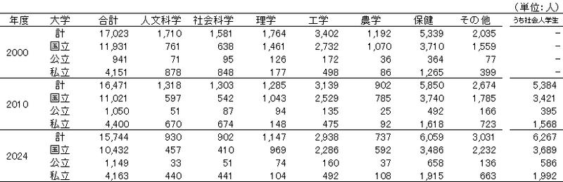 2024年度の専攻別の内訳を見ると、「保健」系が0.6万人、「工学」系0.3万人と多くを占め、「理学」系、「人文科学」系、「社会科学」系は1,000人前後である。経年変化を見ると、「保健」系や「その他」以外は減少傾向にあった。その中で「工学」系については、2010年代後半から増加傾向に転じた。2024年度は全専攻で増加したが、増加率が大きかったのは順に「その他」、「理学」系、「農学」系である。