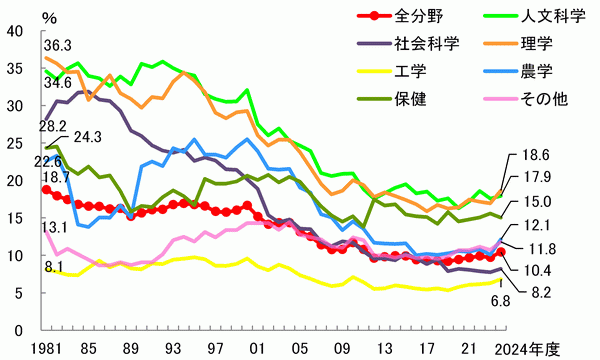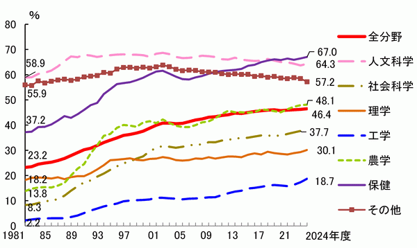 分野別に見ると、2024年度では「保健」系が最も大きく、67.0%である。次いで「人文科学」系が64.3%である。「人文科学」系は1981年度から60~70%で推移し、最も大きかったが、2019年度以降は「保健」系が上回っている。「工学」系は最も小さい割合であるが(18.7%)、1981年度と比較すると、8.5倍となっており、着実に増加している。