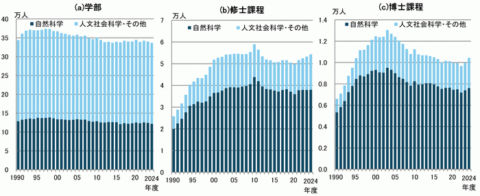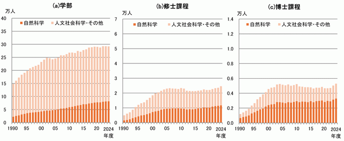 博士課程の入学者数は、女性は2004年度をピークに長期的に微減傾向、男性は2003年度まで急増した後、長期的に減少していたが、男女ともに2023、2024年度は続けて増加した。男女ともに「自然科学」系の方が「人文社会科学・その他」系より多い。男性はピーク時(2003年度)と比べて両分野ともに20%減少しているのに対して、女性はピーク時(「人文社会科学・その他」系は2004年度、「自然科学」系は2003年度)と比べて、「人文社会科学・その他」系は18%減少しているが、「自然科学」系は17%増加した。