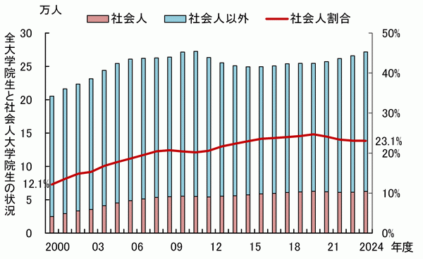 日本の全大学院生(在籍者)に占める社会人大学院生割合は、2000年度の12.1%から2024年度の23.1%に増加した。