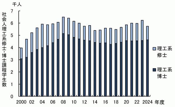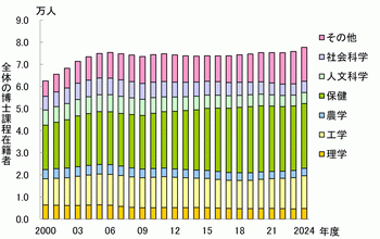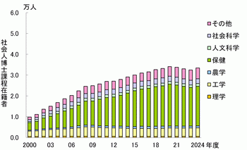 - 社会人博士課程在籍者を専攻分野別に見ると、「保健」系が約6割を占める。長期的にも大きく伸びていた。2020年度をピークに減少に転じたが2024年度では対前年度比で2.7%増加した。「工学」系は、2008年度を境として減少していたが、2018年度から微増している。社会人以外でも「保健」系は多い。2000年度から2008年度にかけて大きく減少し、その後も漸減していたが、2020年度以降は微増している。2024年度では1.0万人となった。「工学」系は2011年度から微減していたが、2019年度以降は微増しており、2024年度では1.1万人であり、「保健」系を上回った。