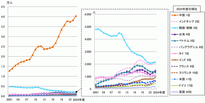 - 日本における外国人大学院生は、2024年度において中国が最も多く、約4.0万人である。次いで韓国・朝鮮、インドネシアが約2,200人であり、1位と2位以降に大きな差がある。