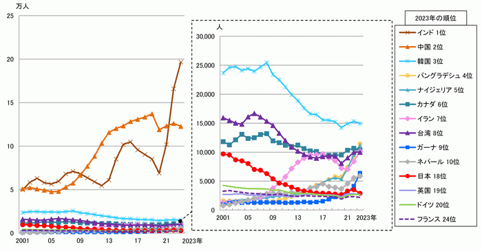 3位以降の国・地域や主要国について、2001年時点と比較すると、韓国、台湾、日本、ドイツ、フランスは30%以上減少している。最も減少しているのは日本である(70%減)。500%以上増加したのは大きい順にナイジェリア、イラン、ネパール、バングラデシュ、ガーナである。