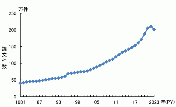 - 世界の研究活動のアウトプットである論文量は一貫して増加傾向にあったが、2023年は4.4%の減となった。2023年の世界の自然科学系の論文数は201万件である。