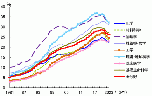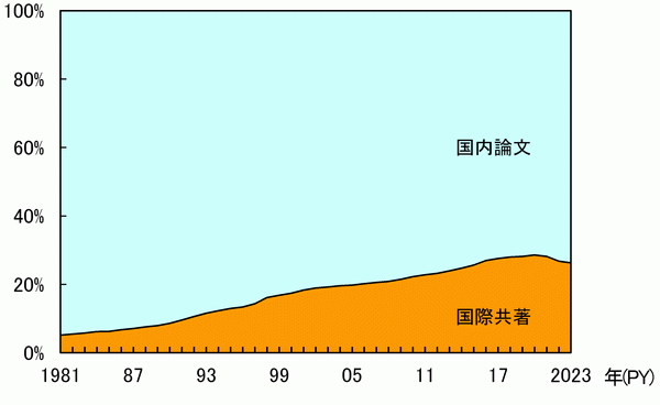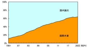 まず、国際共著論文は長期的に増加しており、国境を越えた形で知識生産活動が行われていると考えられる。世界の論文に占める国際共著論文の割合は1981年から継続して上昇していたが、2020年の28.6%をピークに低下し、2023年では26.3%となった。