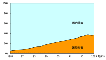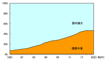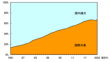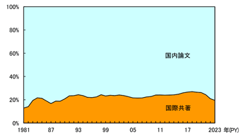 2) 国内論文は、単一の機関による論文及び同一国の複数の機関による共著論文を指す。国際共著論文は異なる国・地域の機関による共著論文を指す。