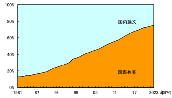 国際共著論文は、国際的な研究協力や共同活動により生みだされる成果であるため、その割合は分野ごとの背景に依存すると考えられる。例えば、大型研究施設を、各々の国で保有することが現実的に不可能な場合、国際的な大型研究施設設置国を中心とした共同研究が促進される。
