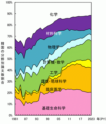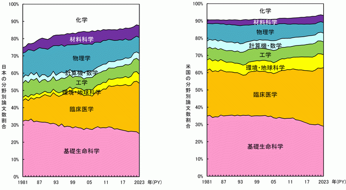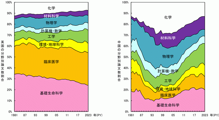 日本は、1980年代前半は、基礎生命科学、化学、物理学の占める割合が大きかった。1981年と2023年を比較すると、化学は11.9ポイント、基礎生命科学は6.4ポイント、物理学は4.7ポイント減少している。他方で、17.3ポイント割合が増加した臨床医学に加え、材料科学(3.6ポイント増)と環境・地球科学(3.4ポイント増)は増加傾向にある。