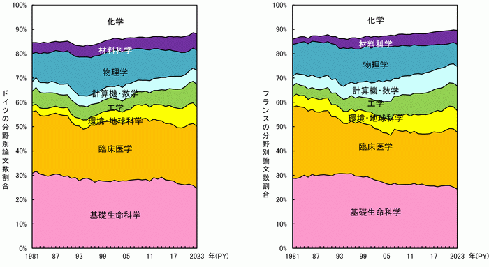 フランスは、臨床医学(6.0ポイント減)、基礎生命科学(4.6ポイント減)、物理学(3.9ポイント減)、工学(5.5ポイント増)、環境・地球科学(4.5ポイント増)、計算機・数学(3.9ポイント増)で変化が見られる。