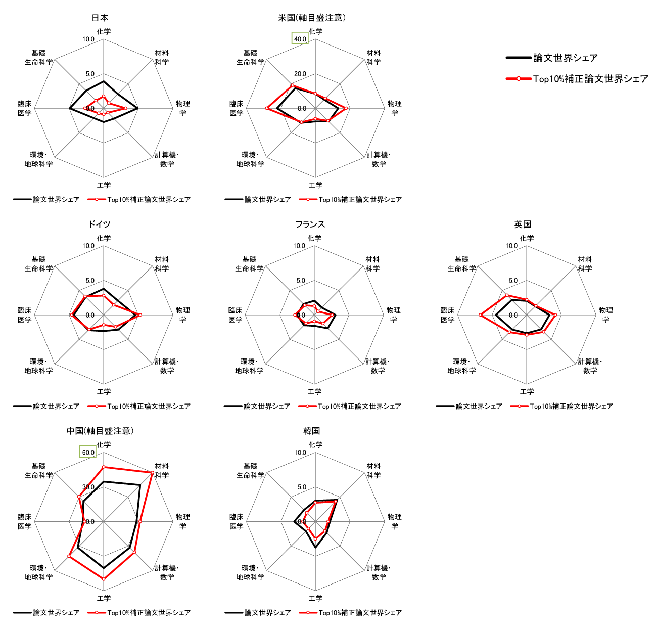 米国は臨床医学、基礎生命科学、物理学の順でシェアが高い。英国は臨床医学、物理学、基礎生命科学の順でシェアが高い。ドイツは物理学、臨床医学、基礎生命科学、フランスは臨床医学、物理学、基礎生命科学の順でシェアが他分野と比べて高い。中国は、材料科学、工学、化学の順でシェアが高い。韓国は、材料科学、化学、工学の順でシェアが高い。