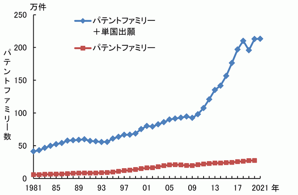 以下では、2つの値を示す。一つはパテントファミリー数(2か国以上への特許出願)に1か国のみへの特許出願数(単国出願数)を加えた数であり、もう一つはパテントファミリー数である。ここでは前者を「パテントファミリー+単国出願数」、後者を「パテントファミリー数」と呼ぶ。パテントファミリーは、発明者や出願人が居住する国以外での権利化を目指して、2か国以上に出願していると考えられ、単国出願よりも価値が高い発明と考えられる。