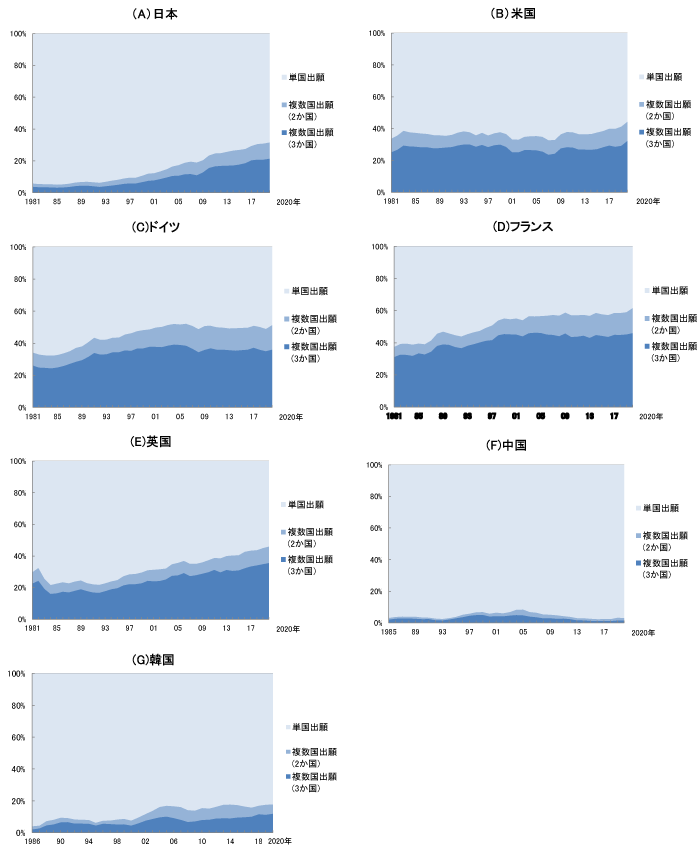 中国と韓国における複数国出願の割合は、それほど高くない。年によって割合に揺らぎがあるが、2020年時点で中国は3.2%、韓国は17.8%である。中国については、国内のみへの出願が増加した影響で、複数国出願の割合が減少している。