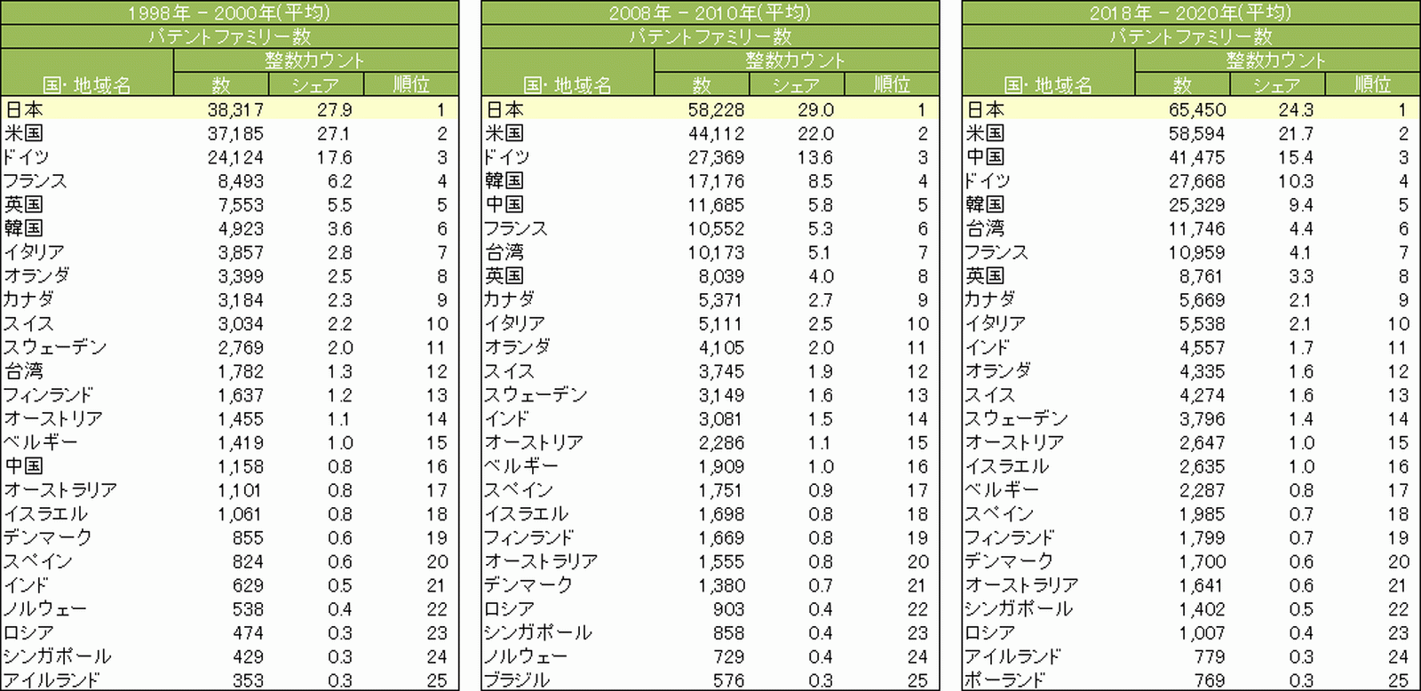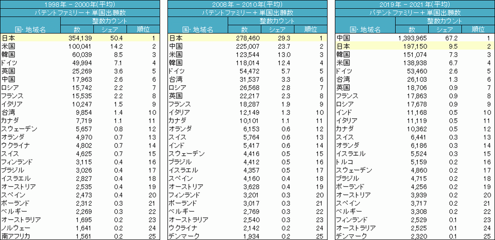 日本のパテントファミリー+単国出願数は、1998-2000年、2008-2010年時点では第1位であったが、2019-2021年時点では中国に次ぐ第2位である。2019-2021年時点では、これに韓国、米国、ドイツ、台湾が続いている。