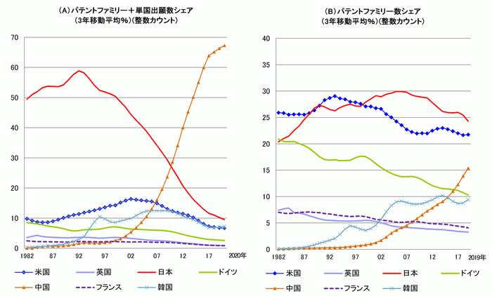 パテントファミリー+単国出願数シェアを見ると、日本は1980年代から1990年代にかけて、他国を大きく引き離している。1990年代の前半には、日本のシェアは60%近くに達したが、1990年代半ばから急激に減少している。この間、1980年代後半から米国、1990年代前半から韓国、2000年代前半から中国が、パテントファミリー+単国出願数を伸ばした。2010年以降、日本と中国の順位が入れ替わり、2020年(2019-2021年の平均)時点では中国のシェアが67.2%、日本のシェアが9.5%となっている。中国が急速にパテントファミリー+単国出願数シェアを増加させるのに伴い、近年は全ての主要国でパテントファミリー+単国出願数シェアは低下傾向にある。