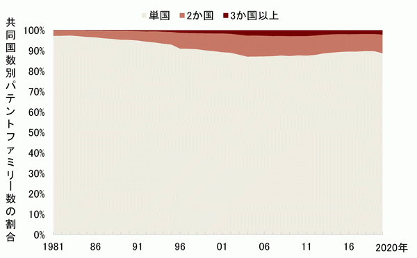 パテントファミリーにおける国際共同の状況を見ると(図表4-2-7(A))、国際共同(共同国数が2か国と3か国以上)によるパテントファミリーの占める割合は、1980年代には5%に満たなかった。1990年代以降、徐々に増加し、2000年半ばには13%にまで達しており、パテントファミリーにおける国際協力関係が強まっていることが伺えた。しかし、その後、国際共同によるパテントファミリーの占める割合は、減少傾向に転じ、2020年には11.3%となっている。