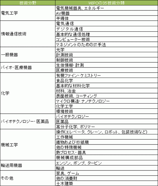 ここでは、技術分野ごとにパテントファミリー数の状況を分析した結果について述べる。技術分野の分類には、WIPOによって公表されている技術分野と国際特許分類(IPC)の対応表を用いた。WIPOの技術分野は、図表4-2-9に示すように、35の小分類に分類されているが、ここでは、これらをまとめた9技術分野を用いる。