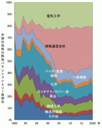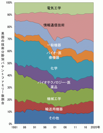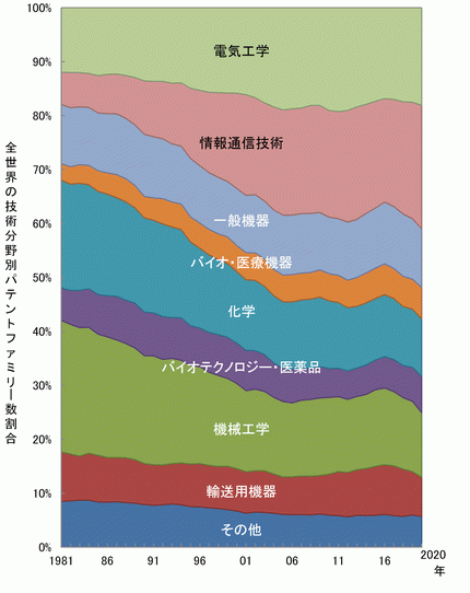 2020年時点の日本の技術分野バランスを見ると、世界全体と比べて一般機器、機械工学、電気工学、輸送用機器の割合が高くなっている。他方、バイオ・医療機器、バイオテクノロジー・医薬品の割合は、世界全体と比べて低くなっている。時系列で見ると、日本において多くを占める電気工学の割合は2010年前後から減少傾向にある。同時期に機械工学、輸送用機器の割合が増加していたが、近年は減少している。1981年と2020年を比べると、情報通信技術の割合が9.4ポイント増加しているが、その割合は世界全体における情報通信技術の割合と比べて小さい。