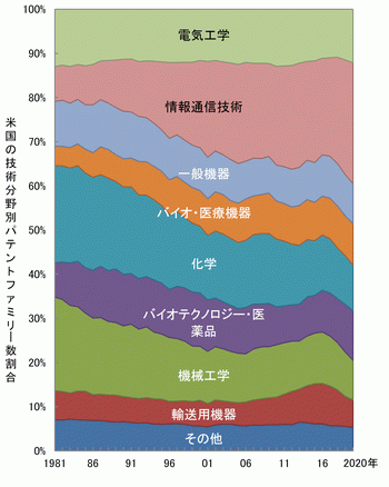 米国は、世界全体と比べて、バイオテクノロジー・医薬品、バイオ・医療機器、情報通信技術の割合が高い。1981年と2020年を比べると、情報通信技術が19.4ポイント増加し、機械工学は12.2ポイント、化学は11.6ポイント減少している。また、輸送用機器の割合は2005年頃から増加傾向にあったが、近年では減少した。電気工学と機械工学の割合は世界全体と比べて小さい。