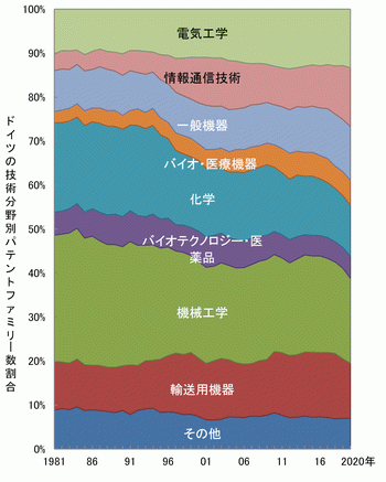 ドイツは、輸送用機器、機械工学、一般機器の割合が世界全体と比べて高い。1981年と2020年を比べると機械工学は9.3ポイント、化学は8.7ポイント減少している。情報通信技術は9.6ポイント増加しているが、その割合は世界全体における情報通信技術の割合の約6割(2020年時点)となっている。また、電気工学やバイオテクノロジー・医薬品の割合も、世界全体と比べて小さい。