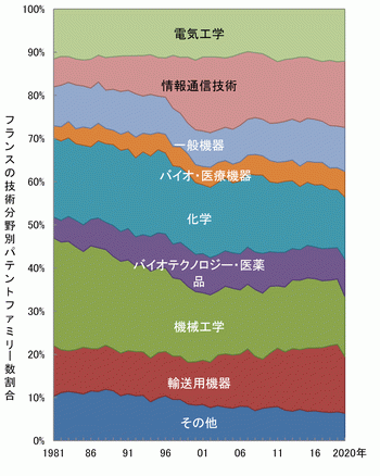 フランスは、輸送用機器、化学、バイオテクノロジー・医薬品、機械工学の割合が世界全体と比べて高い。1981年と2020年を比べると、機械工学の割合は11.0ポイント減少している。情報通信技術の割合は8.9ポイント増加しているが、その割合は世界全体における情報通信技術の割合と比べて小さい。また、電気工学の割合も、世界全体と比べて小さい。