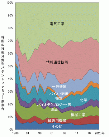中国は急激に世界シェアを伸ばしており、特に情報通信技術、電気工学、一般機器で伸びが顕著である。2018-2020年時点での中国の情報通信技術は25.1%、電気工学は17.8%である。韓国については電気工学が16.0%、情報通信技術が10.8%と世界シェアの10%を超えている。