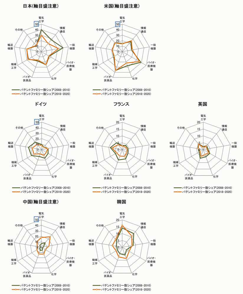 米国はバイオテクノロジー・医薬品、バイオ・医療機器で世界シェアが30%を超えている。ドイツは輸送用機器、機械工学において世界シェアが20%を超えていたが、2018-2020年では、それぞれ17.5%、16.3%となった。フランスは輸送用機器、化学で、世界シェアが5%を超えている。英国ではバイオテクノロジー・医薬品で5%を超えている。これらの国については、2008-2010年と比較すると、多くの技術分野で世界シェアは減少又は横ばいにある。