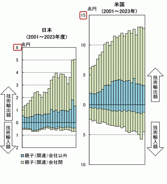 ただし、技術貿易に関するデータでは、国外の系列会社間との技術貿易など企業グループ内での技術移転が、国家間の技術貿易のかなりの部分を占めていることが往々にしてある。系列会社間での技術貿易は、技術知識の国際移転の指標ではあるものの、技術の国際的な競争力を示す指標という性格は薄い。各国の技術力の指標として技術貿易を用いる際には、企業グループ内での技術移転は除外して考える方が自然である。そこでデータが利用可能な日本と米国の技術輸出額・輸入額について、系列会社間とそれ以外の技術貿易を比較する。
