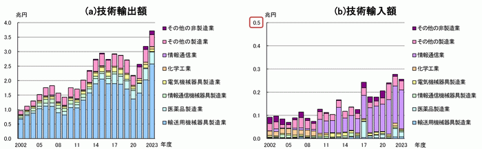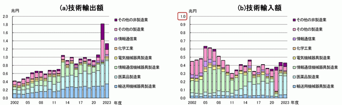 - 日本の産業分類別の技術貿易について親子会社間での状況を見ると、技術輸出額が最も多い産業は「輸送用機械器具製造業」である。2023年度で2兆5,717億円と全産業の69%を占めている。2015年度をピークに減少傾向にあったが、2021年度以降増加している。技術輸入額は、「情報通信業」が2010年度以降大きく増加した。2023年度では1,677億円であり、対前年度比は5%増である。