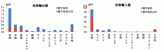 日本の技術輸入額(対価を支払った額)では、米国が最も多く、約6割が親子会社以外での取引(2,851億円)である。米国と比較すると2位以降の国・地域の額は極めて少ない。
