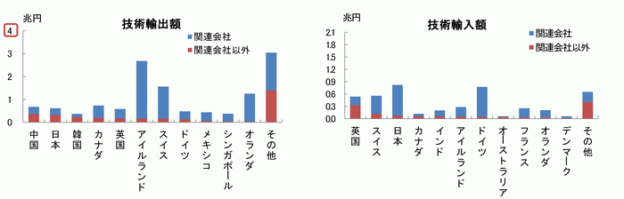 米国の技術輸出額を見ると、関連会社以外での取引では、中国(3,558億円)、日本(3,153億円)への技術輸出額が多い。なお、関連会社間の技術輸出額はアイルランド(2.5兆円)やスイス(1.4兆円)で多い。アイルランドやスイスは企業の法人税が欧州内でも安い国(2024年時点)であり、関連会社間での技術貿易は技術力以外の要因も含むことが分かる。
