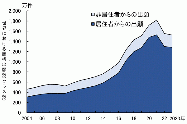 図表5-3-1は、世界における商標出願数を、「出願人が居住している国・地域へ出願した商標数」と「出願人が居住していない国・地域へ出願した商標数」に分類し、示したものである。2023年における世界の商標出願数は1,523万件である。内訳を見ると、居住者からの商標出願数が1,283万件、非居住者からの出願は240万件である。2004年から2009年にかけては緩やかな伸びであったが、2009年から2014年にかけて伸びが加速し、その後は更に大きく伸びていた。しかし、2021年をピークに居住者・非居住者からの出願ともに減少している。