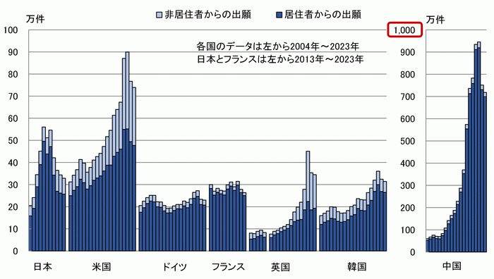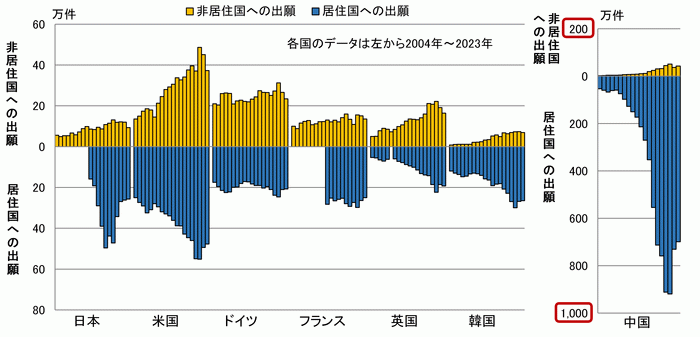 フランスは2004年時点では非居住国への出願数がドイツ、米国に次いで多かった。その後の伸びは緩やかであり、2023年では14万件となった。