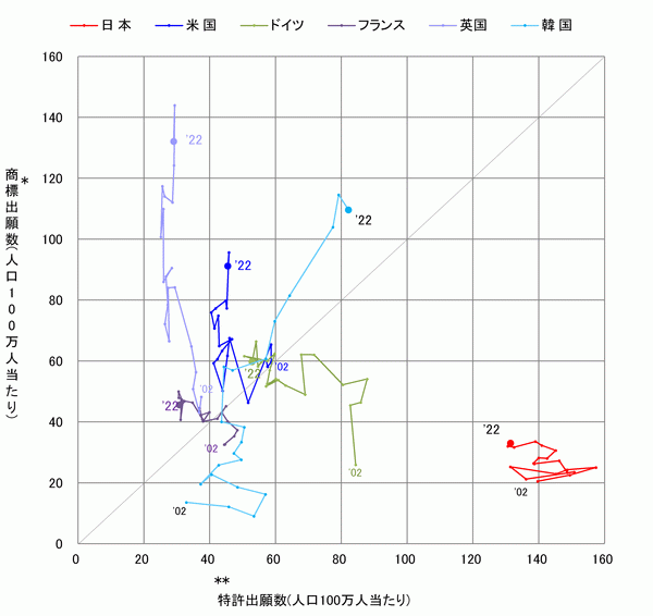 - 国境を越えた商標出願数と特許出願数(三極パテントファミリー数:日米欧に出願された同一内容の特許)について、人口100万人当たりの値で比較すると、最新年で商標出願数よりも特許出願数が多い国は、日本のみである。最新年で商標出願数が特許出願数より多い国は、英国、韓国、米国、ドイツ、フランスである。韓国、英国、ドイツについては2002~2022年にかけて、商標の出願数が大きく増加した。