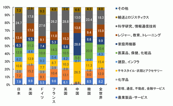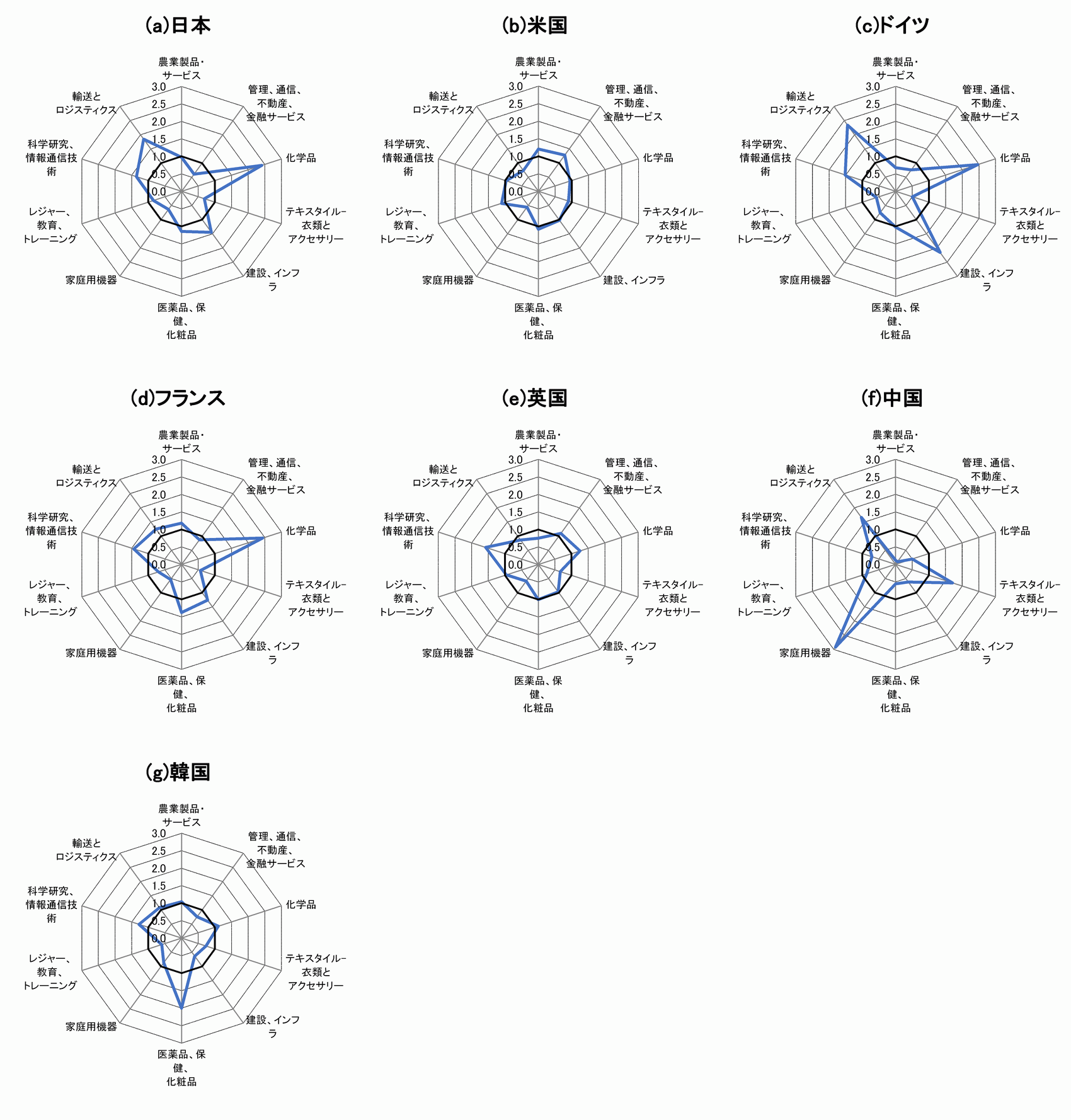 特化係数を見ると、各国において最も特化しているのは、日本、ドイツ、フランスは「化学品」、英国は「科学研究、情報通信技術」、中国は「家庭用機器」、韓国では「医薬品、保健、化粧品」である。米国特許商標庁への出願を分析しているので、米国の特化係数には他国のように突出した産業は見られないが、米国では「管理、通信、不動産、金融サービス」の特化係数が最も大きい。