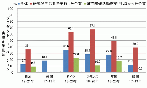 研究開発活動を実行しなくとも、プロダクト・イノベーションを実現した企業もある。ドイツは、研究開発活動を実行しなかった企業のうち、22.6%がプロダクト・イノベーションを実現しており、他国と比較すると高い値である。最も低い国は韓国であり、0.3%と研究開発活動を実行しなかった企業は、ほぼプロダクト・イノベーションを実現しなかったことが分かる。