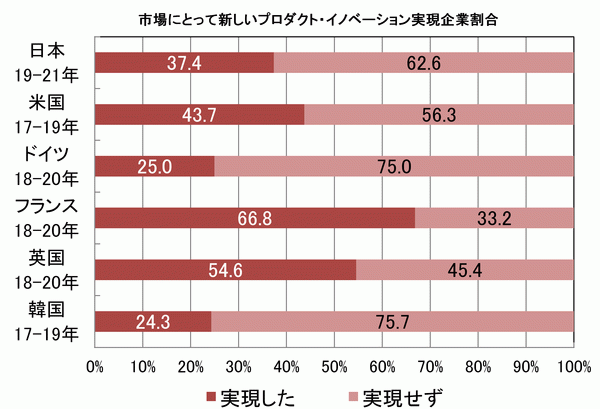 日本のプロダクト・イノベーション実現企業のうち、市場にとって新しいプロダクト・イノベーションを実現した企業の割合は37.4%である。主要国中最も高いのはフランス66.8%、英国は54.6%であり、半数を超えている。米国は43.7%である。ドイツは25.0%であり、韓国は24.3%と他国と比較すると低い数値となっている。